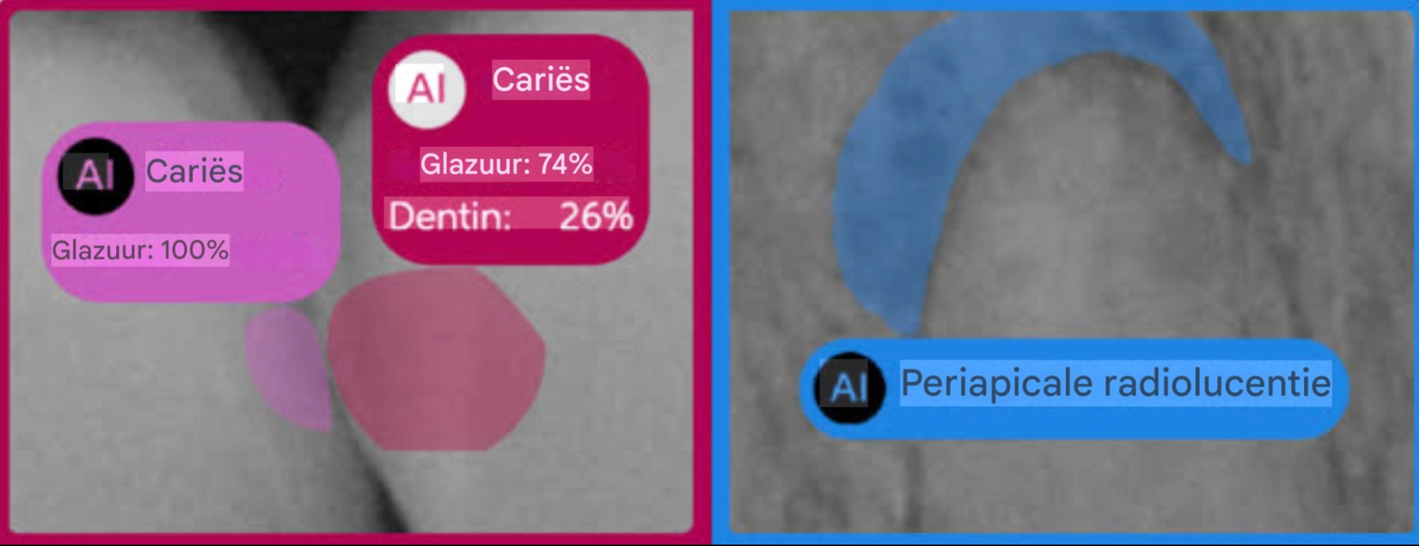 Het ai programma is getraind met extreem veel röntgenfoto’s die eerder door experts zijn beoordeeld. Daardoor kan het systeem patronen herkennen die iets kunnen zeggen over bijvoorbeeld tandbederf of botverlies. Op jouw röntgenfoto zet het kleine en gekleurde markeringen bij mogelijke bijzonderheden. De tandarts bekijkt deze suggesties, weegt ze mee en legt je rustig uit wat ze betekenen.